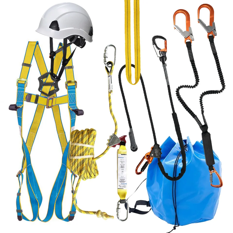 Szelki bezpieczeństwa + podwójna lonża typu V + linostop 20m + linka do pozycjonowania + karabinek stalowy + worek transportowy.